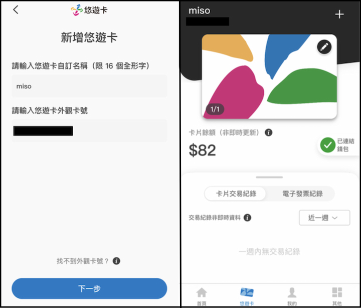 可以幫你的悠遊卡取名字「輸入名稱」,再來「輸入卡號」。(卡號在悠遊卡背面右下方的一串數字)