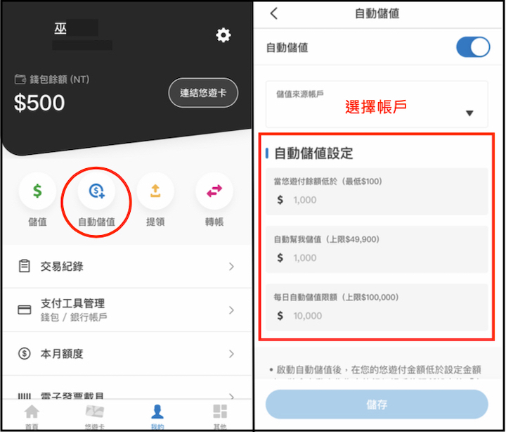 點進去後打開自動儲值的開關,就可以做設定喔!