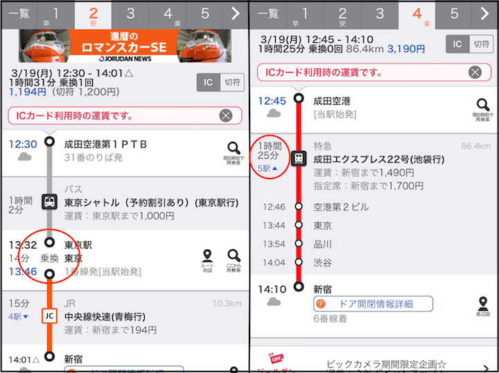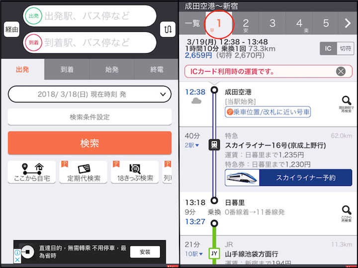 在上方左圖看到「出発」跟「到着」就是要輸入出發地跟目的地,若是乘車當下搜尋的話就不用調日期、時間,會自己從當下的時間搜尋,而按下搜尋之後,就會出現像右方的畫面了。