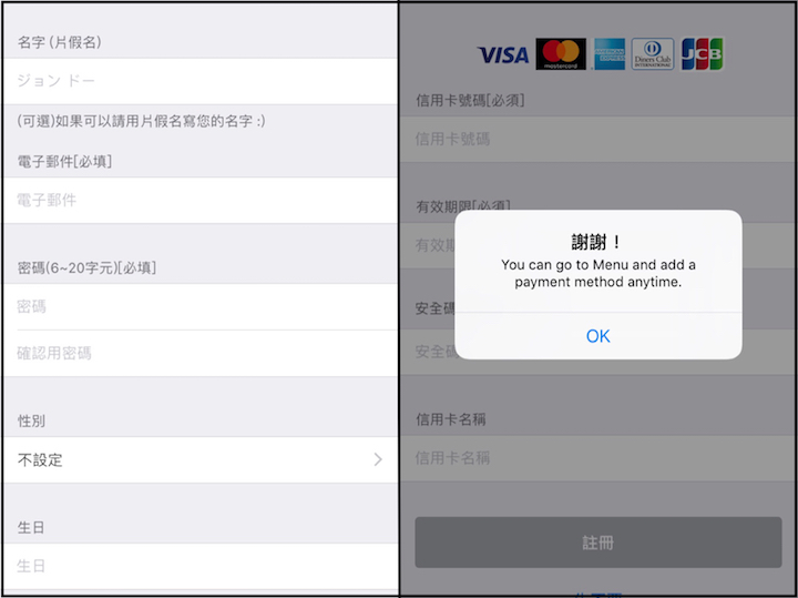 而下載後,進入頁面時,需同意規範,填手機號碼(可填台灣),就會收到驗證碼的簡訊,進入後必須填一些基本資料(如上方左圖),主要是在名字的地方是需要填日文片假名(英文及中文無法),故可以先上網搜尋一下日文名字或是若有朋友會日文的也可以請他幫忙一下,因為是外國人所以也不一定要很正確,或是取一個日文名字輸入即可,主要這部分順利的話,就沒什麼問題。