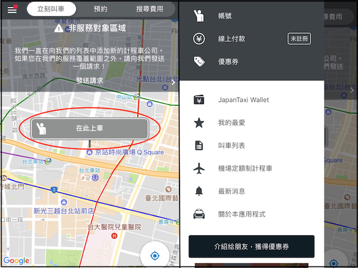 進入後就會到如上方左圖的地方,(因圖是在台灣開啟,所以會顯示非服務對象區域,也無法叫車。)若要立即叫車的話,google會定位到你所在的地方,按下「在此上車」後,離你最近的計程車就會接收到訊息,就會過來載你了!是不是超方便的啊!若要預約的話也是可以的喔!