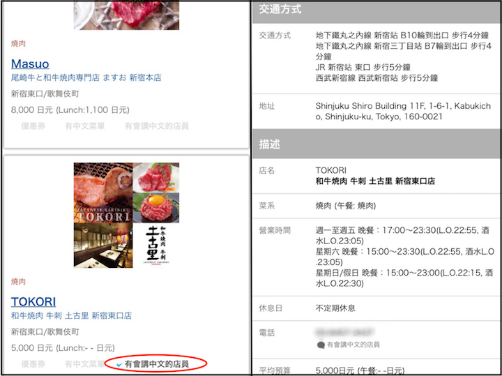 像上方圖示,它還會秀出是否有優惠券、中文菜單、會講中文的店員,讓不會日文的旅客都可以作為一個參考呢!重點是大家都會想了解的價格,也都會有一個大概參考的價錢,這點我就覺得非常的棒啊!!!