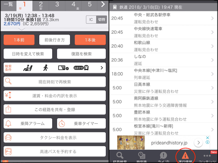 從此APP裡也可以看到如上圖這些資訊,像是要找搜尋的前一班車或後一班車,不需要再去調時間,只要按下「一本前」或「一本後」就可以快速的搜尋,或是更詳細的搜尋,都可以去做調整。而如上方右圖,有個「運行情報」,如果有生活在日本一段時間的人,基本上會碰到幾次的「人身事故」吧!在日本的時候真的很常遇到,電車就會因為這樣而延遲,而或是因為天氣等等狀況,想知道電車的情報時,按下運行情報就會知道因為什麼問題而導致電車延誤了。