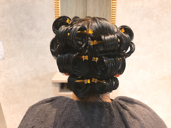 上完後會將頭髮往上捲固定,