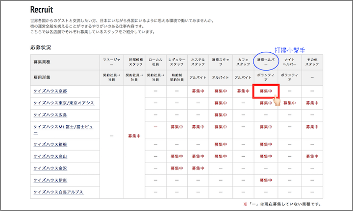 接下來就會到這頁面,看到藍色圈起來的地方「清掃ヘルパー・ボランティア」,就是指不收薪水的打掃小幫手。