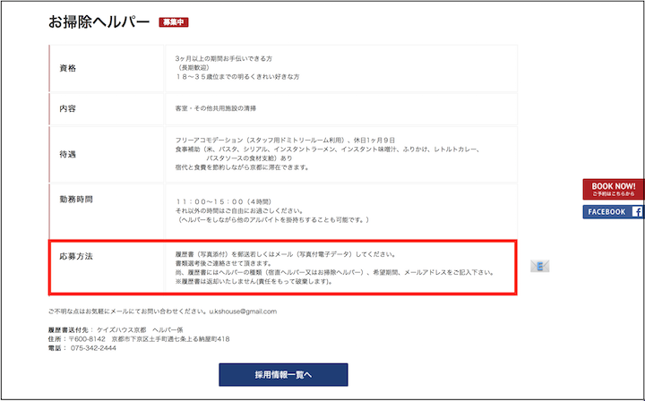 而到了這個頁面後,就會有一些資格說明以及稍微地介紹工作內容、待遇等等,若要應徵的話就寫MAIL過去詢問即可唷!